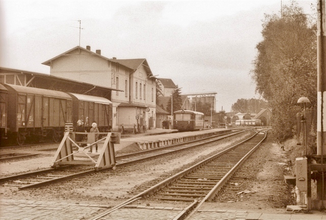 Dieses Foto, entstanden bereits nach der Teil-Stilllegung Anfang der 1970er Jahre, zeigt, dass immer noch zwei Waggons am Güterschuppen stehen, um das umfangreiche Stückgut umzuschlagen. Inzwischen ist der Güterschuppen längst abgerissen.